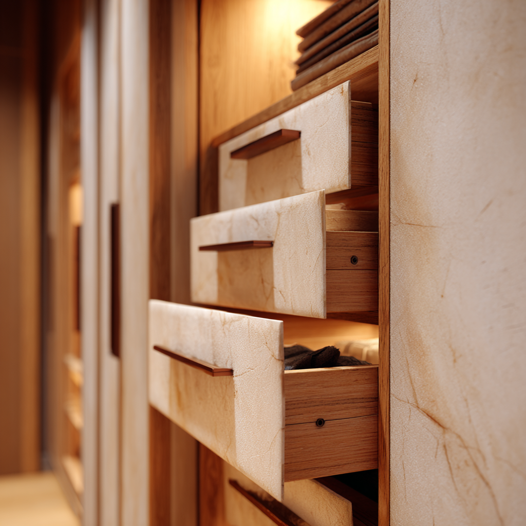 Materijali kao što su iverica, MDF i drvo koriste se za izradu trajnih konstrukcija. Klizni sustavi omogućuju glatko otvaranje vrata bez dodatnog prostora.